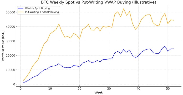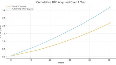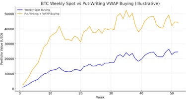 The price fluctuation of the underlying equity, BTC, does not impact the profitability of the put-writing VWAP buying strategy. Backtesting estimate of the projected minimum weekly option premiums is 1.5%.