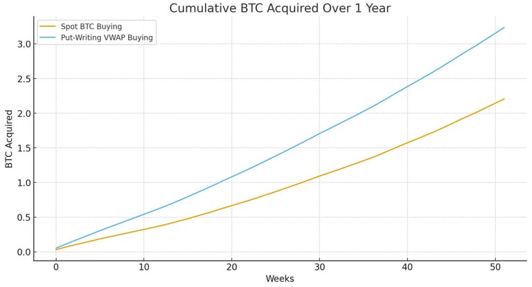 The simulation of performance based on last year's data suggests you would expect to be up about 50% compared to simple spot BTC buying, filling your intended position over one one-year period.